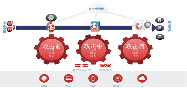 在攻击发生之前,能够全面的了解整个网络的状况,通过实施细粒度的安全控制策略以及对系统/主机/流量等的加固措施,提高系统对攻击的防御能力,进而最大限度减少攻击的可能性。在攻击发生之中,需要采用智能分析和关联等技术,准确的检测出攻击所在,并且充分利用相关的设备和防御手段,对攻击进行阻挡和全面的防御。在攻击发生之后,可以通过入侵事件关联分析、异常流量分析以及恶意软件防护的攻击跟踪追溯技术,准确的定位出攻击的范围以及影响,并且做出有效的响应和修复,最大限度减少攻击的危害。