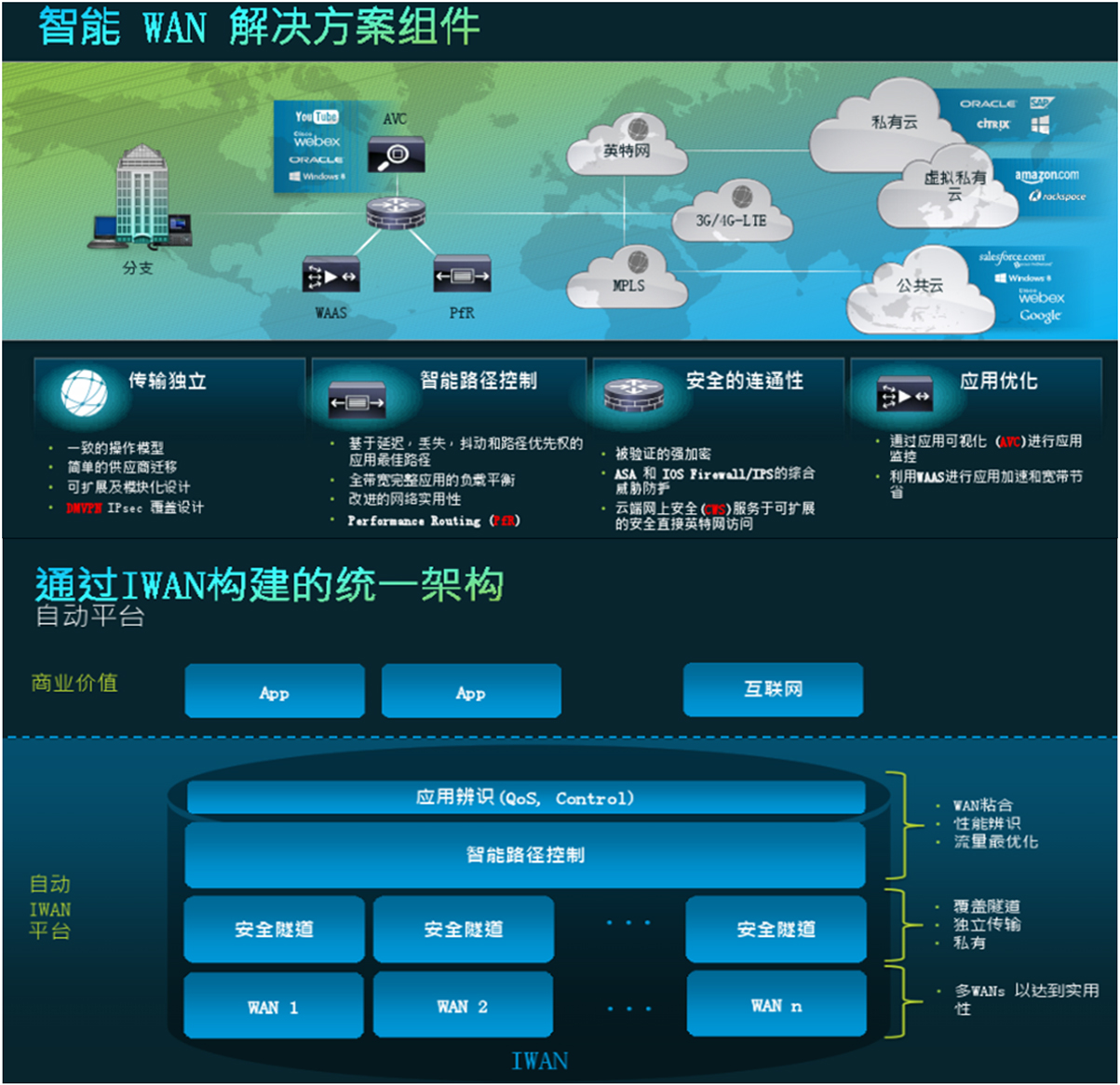为了应对这些要求,本公司推出了思科开发的一种名为智能广域网 (IWAN) 的新方法。IWAN 可实现通过低成本的互联网服务来取代高价的高级广域网服务,而不影响分支机构的可用性、质量或服务要求。